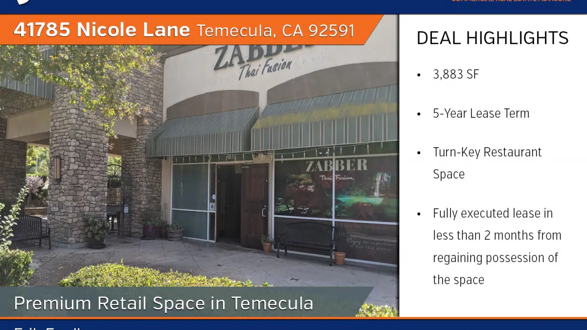 Erik Egelko, a commercial real estate broker with SVN Vanguard’s San Diego office has successfully brokered a deal for a 3,883 SF restaurant space at the Creekside Centre in Temecula, CA. Trattoria Toscana has signed a 5 year lease agreement and will be relocating from their existing location nearby.